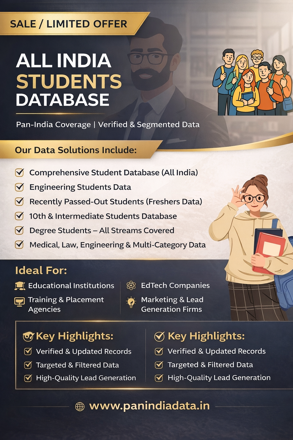 This database is designed for EdTech companies, training institutes, universities, coaching centers, recruiters, scholarship providers, and education service providers looking to engage with students for admissions, learning programs, career opportunities, and academic services.